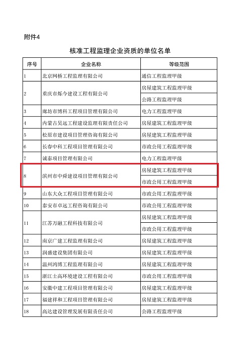 2019年4月2日,國家住房和城鄉建設部正式公布核準我公司房屋建筑工程監理、市政公用工程監理甲級資質。此次資質的成功升級是我公司資質建設的又一個里程碑。 資質升級成功后,公司在工程監理領域將迎來更廣闊的發展空間,也標志著我公司在監理行業中將具備更高的水準。